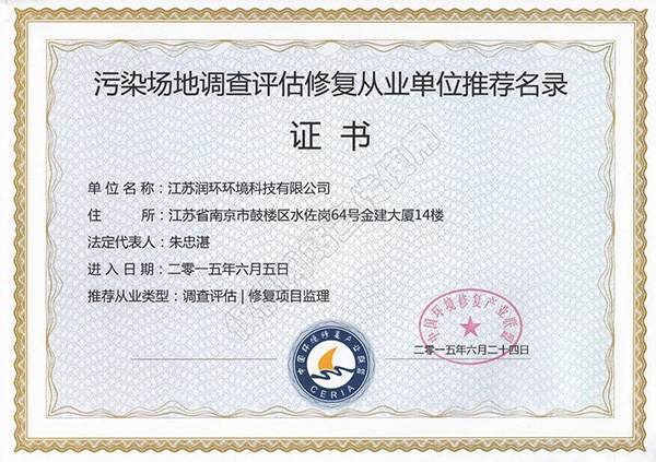 污染場地調(diào)查評估修復從業(yè)單位推薦名錄證書