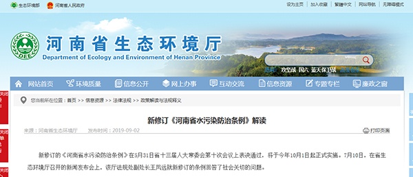 2019年09月02日,河南省生態(tài)環(huán)境廳發(fā)布新修訂《河南省水污染防治條例》解讀,詳情如下:
