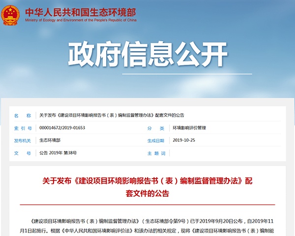 2019年10月25日,生態(tài)環(huán)境部發(fā)布了《建設(shè)項(xiàng)目環(huán)境影響報(bào)告書(表)編制監(jiān)督管理辦法》配套文件,詳情如下: