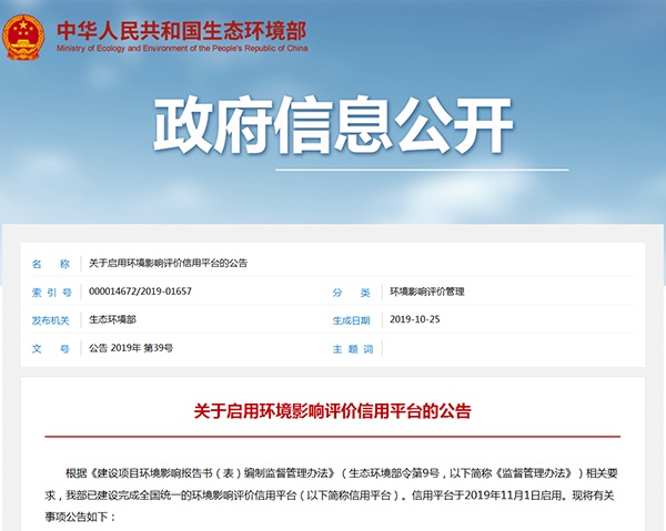 2019年10月25日,生態環境部發布關于啟用環境影響評價信用平臺的公告,詳情如下: