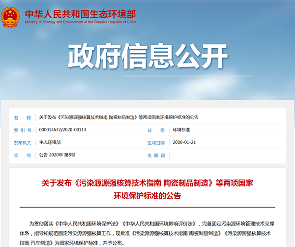 2020年1月21日,生態環境部發布了《污染源源強核算技術指南 陶瓷制品制造》《污染源源強核算技術指南 汽車制造》兩項國家環境保護標準,詳情如下: