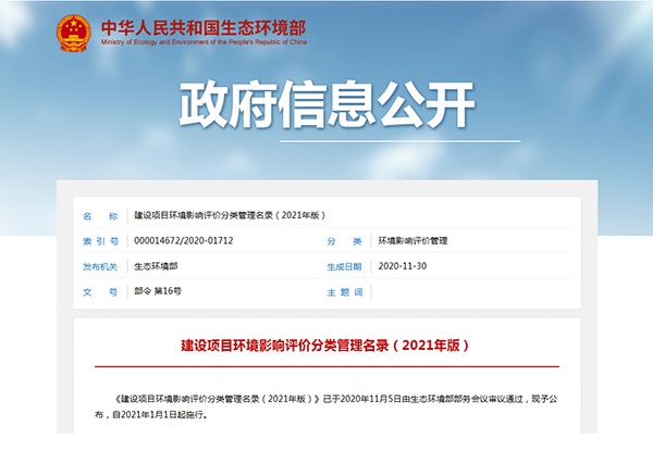 生態環境部發布《建設項目環境影響評價分類管理名錄(2021年版)》的公告
