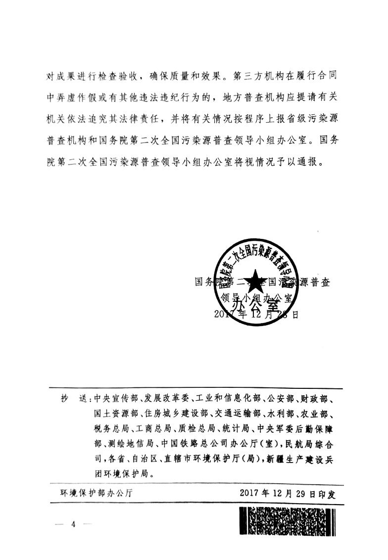 上一篇:國污普【2017】10號關于第二次全國污染源普查普查員和普查指導員選聘及管理工作的指導意見 下一篇:國污普【2018】1號關于印發(fā)《第二次全國污染源普查伴生放射性礦普查檢測技術規(guī)定》的通知全文
